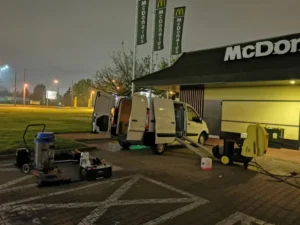 Do mycia i czyszczenia elewacji wykorzystujemy specjalne myjki niskociśnieniowe na gorącą wodę. Jako jedyni posiadamy myjki specjalnie przeznaczone do mycia elewacji. Pierwsze urządzenie jest to myjka karcher na prąd 400v do jej użycia potrzebujemy przyłącza siłowego ( 4 lub 5 bolców mufa). Druga profesjonalna myjka karcher niskociśnieniowa na gorącą wodę nie potrzebuje prądu jest zasilana silnikiem spalinowym. Przy jej użyciu doliczymy niewielki koszt za paliwo, ale są to nieznaczne kwoty, więc nie ma o co się martwić. Obie myjki natomiast mają kotły grzewcze na ON, ale koszt podgrzania wody jest po naszej stronie.